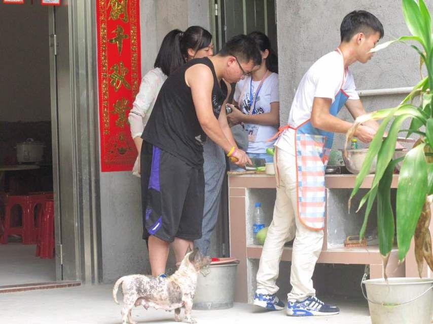 做饭烧菜是买菜后的又一重要任务。每天的后勤队长都要安排好队员的工作。分工明确才能提高工作效率,队员们在相互协作中,很快就能做出一顿顿虽然家常却不失美味的菜肴。有趣的是,因为我们是烹饪与营养教育专业的学生,所以,负责煮菜的队员间总会出现关于菜品该如何烹制的争论,充分体现烹饪班的专业特色,并做到了学以致用。由于学校的厨房较简陋时,我们只能借用队长家的厨房,即使厨房中有抽风机,但在这炎热的7月,负责烧菜的队员待在厨房烧菜时也依然是大汗淋漓的,衣服全被汗浸湿,可是他们依然毫无怨言,并坚持到最后,每日饭桌上一个个扫空的菜碟子就是对后勤人员们最大的安慰!