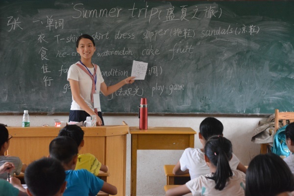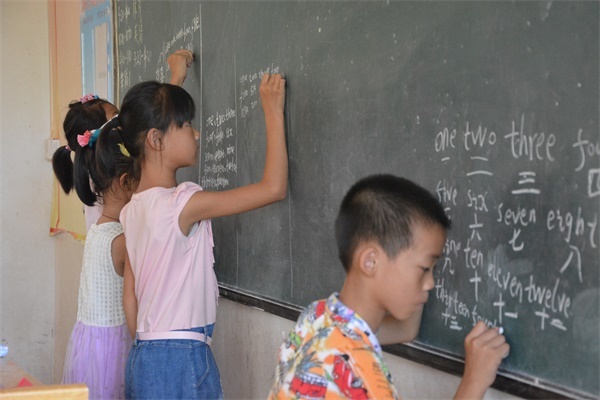 小老师们采取了把英语融入到游戏当中的方式。她们先是教给学生一些新的单词,然后引入疯狂英语的方法,带领他们大声地朗读单词,同学们都很给力,整齐的读书声从窗口传出,在空旷的操场中回荡,使人听了心旷神怡,仿佛拥有了一股神奇的力量。在同学们完全记住新单词之后,游戏开始了。小老师们在黑板上写下很多个英文字母,然后让小学生在里面找出每一个单词。同学们都很积极,纷纷举手上去答题。他们稚气的脸上透露出认真,用力地握住粉笔,在黑板上郑重地写下自己的答案,这种场景让小老师们为之骄傲。更令队员们感动的是,班里一位性格比较内向的男孩子鼓起勇气举了手,勇敢踏出了第一步,这一步或许会对他以后的人生有着一定的影响。