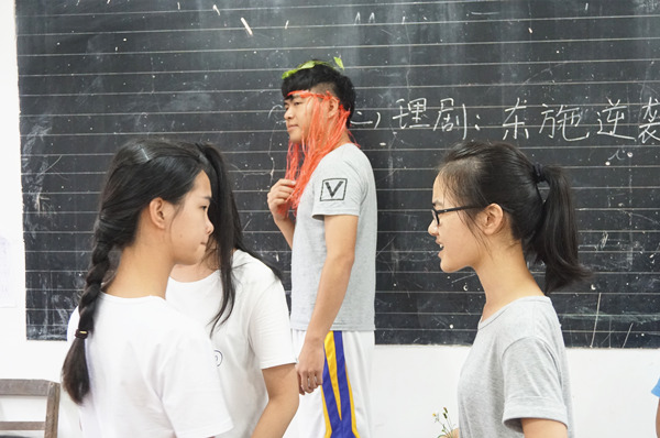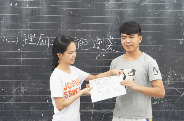 班主任首先简单介绍本次讲座的流程,运用心理剧《东施逆袭》揭示主题。心理剧主要由十名队员友情出演,剧情讲述越国丑女东施因效仿西施,遭遇路人甲乙丙的嘲笑和讽刺。心灵受挫的东施不顾舍友西施的安慰,在失意中遇到同病相怜的师姐,经过师姐的疏导,东施勤学苦练,在一次歌唱比赛中脱颖而出,备受欢迎。期间,教室内掌声阵阵,反串角色东施颇受学生欢迎。“《东施逆袭》实际经历一系列的心理活动,希望通过这个励志角色给同学以正面积极的鼓励。”班主任如是说。