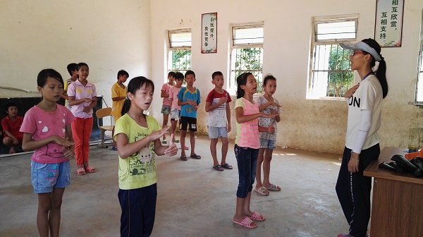 另外,队员们也一边与小朋友们在排练唱歌。今天晚上7点30分,同学们在练习《最美的太阳》,大家激情高涨,一连唱了5遍。先是有原唱陪着唱了两遍,之后是跟着伴奏,自己打着节拍唱。5遍下来,大家的节奏感有明显的提高。这也使得全体队员对明日的演出特别有信心。