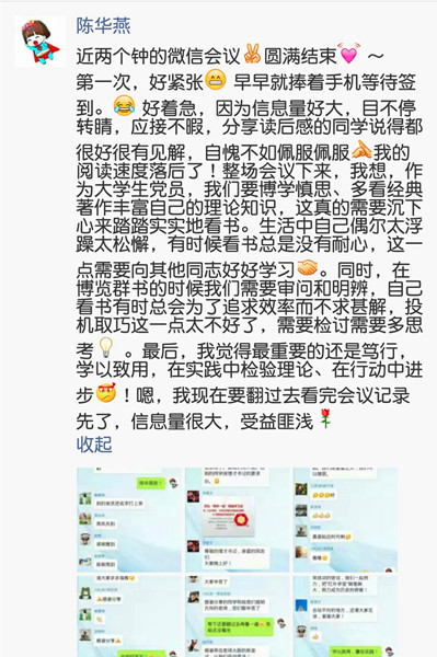 “这种通过线下阅读感悟,线上分享讨论,将新媒体与学习相结合,是一种新的学习组织形式,是个好的创新,也是好的开始。学习结束后,文件资料都保存在记录上,为日后在回头品味提供便利,这是课堂无法比拟的优势。”参加此次网络学习会的萧美如在朋友圈中这样写下自己的感悟外语院党委和教科院党委对新媒体的应用让“两学一做”展现了新形态、新动力与新的局面。