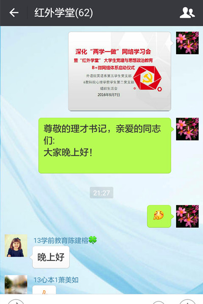如这般关于“两学一做”的好评,一夜之间吹遍了我校外语院和教科院同学的朋友圈。这股热潮,源头在于5月7日开启的深化“两学一做”网络学习会暨“红外学堂”大学生党建与思想政治教育b+微网络体系启动仪式。这是一场在新媒体阵地上举办的活动,是外语院英语系第五学生党支部与教科院心理学前学生第二党支部携手探索的党支部组织生活新形态。