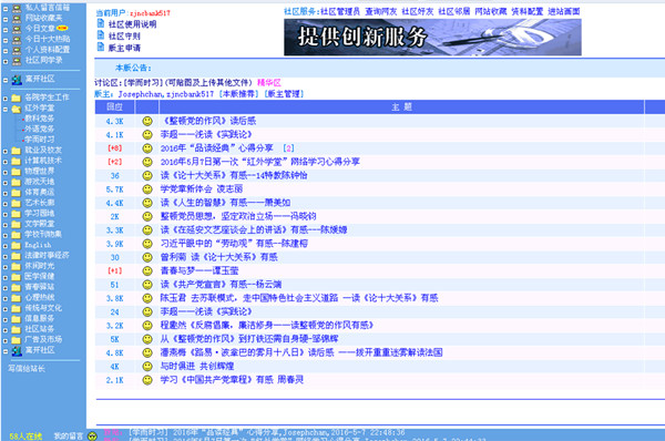 据邓倩文介绍,“红外学堂”外语院党委和教科院党委联合申报的校“书记项目”,取名寓意红色学子网聚一堂,学习红色经典,向外辐射红色文化,渗透网络内外。“b+微网络体系”主要指“红外学堂”以bbs和各个党员的微信、微博为主阵地,实现两种网络媒体的优势互补。其中bbs和微信群作枢纽,开设有《党务工作》版块推动党务工作网络化,还有《学而时习》版块供支部成员学习交流。围绕枢纽,整合各个支部成员个人微信、微博作为辐射传播的卫星式阵地,传播红色文化。“红外学堂”学堂的建设主要有三大目标。一是探索互联网+党建模式。将党务工作规程、流程、过程都记录在bbs《党务工作》版块,让党建工作看得见摸得着,探索新媒体环境下党员组织、教育和动员的新模式。二是建设党支部掌上学习平台。借助新媒体突破时空的限制,网聚党员。通过bbs展现每个成员的学习心得与体会,供各成员跟帖评论互动交流。应用新媒体打造党员口袋学习的模式,实现:无论何时何方,只要党员有一台手机就可以实现组织联络和理论学习永不掉线。三是建设思想引领高地。通过全体成员在自己的微信、微博中亮党员身份,发出自己的学习心得、感悟,传播红色文化,密切党群联系,帮助更多的群众增进对党和对马克思主义的认识与认同。崭新的组织生活理念和做法一经说明,即让两支部成员欢欣鼓舞,更切身感受到新媒体带来的便捷与高效,纷纷点赞,共同启动了“红外学堂”大学生党建与思想政治教育b+微网络体系。
