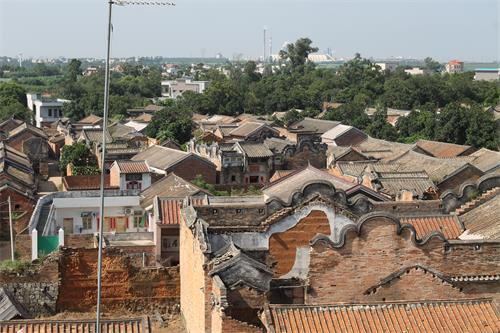 我们首先进入的是苏二村文化宫的侧门,在侧门外有一棵拥有着超过600年寿命的参天大树,村民唤其为梧桐树,而据村民委员会主任介绍,苏二村村民祖祖辈辈在村中居住已超过500年。从侧门而入,不久就看到了黄氏大宗祠。宗祠外面的墙壁上雕刻着一副壁画,内容为世界地图,有约20年历史,图案已偏淡但仍不失其霸气。
