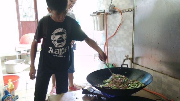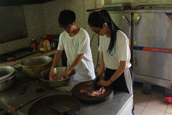 早上五点四十起床,六点跟着阿姨去市场买菜,七点二十之前准备好全队的早餐,负责餐后厨房的清洁,之后就着手准备午餐,厨房清洁,然后又开始准备晚餐.....如此循环的工作听起来简单,其实最繁琐无比,基本上从早上六点开始就要在厨房度过一天,用一位队员的话来说“简直就是用生命在做饭”。