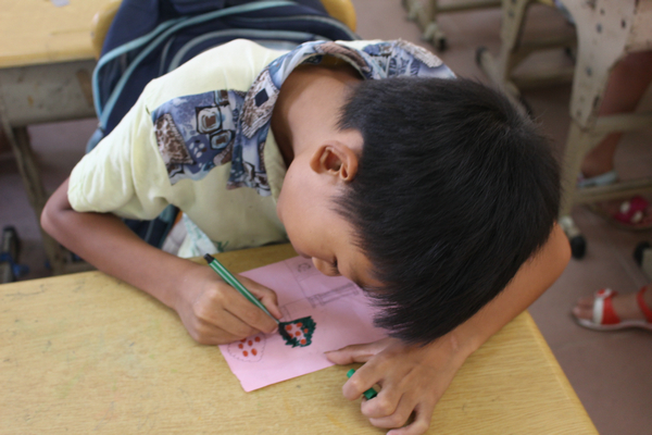 据授课的陈伟成老师说:“孩子们很喜欢美术课,还说学会画画以后要画一个蝴蝶送给我,很天真也很可爱!”在老师的教导下,孩子们发挥自己的想象力,在白纸上画出了一幅幅五彩亮丽的画卷。照片中的小男孩是大洋学堂二年级的一名学生,很喜欢画画。当我们询问他为什么喜欢画画时,他羞涩地说:“因为我想画我喜欢的东西,给他们涂上漂亮的颜色。”美术课作为这次教学的一个特色课程,主要是教孩子们一些简单的绘画,除了培养他们的绘画兴趣,还增强了他们的动手能力。