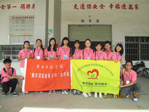7月15号早上8点,岭南师范学院商学院“助学贷款政策下乡行”队员们与朝阳同行,前往高州市潭头镇车站、市场和信宜市镇隆镇车站、市场宣传国家助学贷款政策,并在潭头镇车站和镇隆镇车站进行驻点宣传。