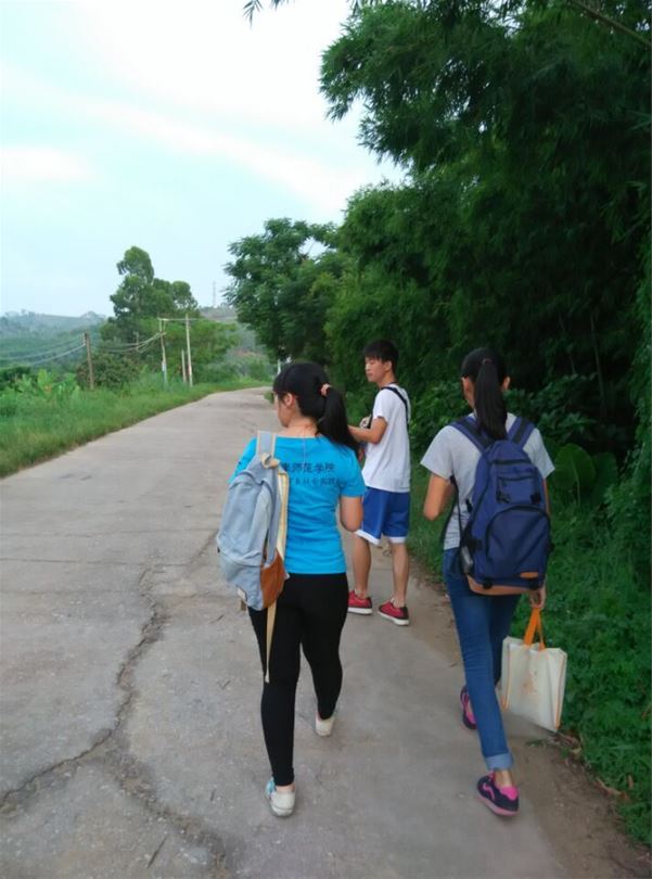 细心数数,那条通向镇政府,镇中心小学的大道,我们已走了不下三次。每天撑着伞,顶着烈日,踏着滚烫的公路,看着络绎不绝的车辆,烟尘滚滚。每天都斗志昂扬地都从这条路开始我们一天的征程,在黄昏的时候再次拖着疲惫的身躯往着基地的方向一点一点地挪动。我们的调研旅途有一半是与这条路一起度过的。可谓“爱得深沉。”