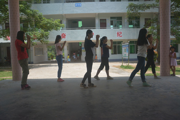 在如此紧张的实践压力下,舞蹈组成员们纷纷自愿放弃自己的午休时间,甚至选择利用晚上的空余时间去小学的三楼一个教室进行舞蹈排练。教室里热浪滚滚,组员们汗如雨下,但他们依旧神情专注,注意力集中,跟着节拍,合着音乐,跟着组长练习高难度舞蹈动作,并尽量把每一个舞蹈动作都详记于心,把每一个舞蹈动作都做得尽善尽美。
