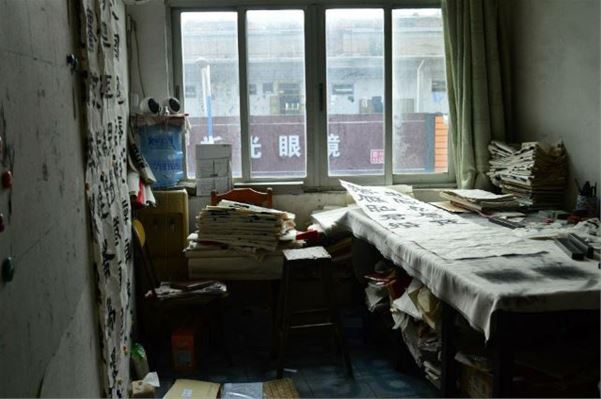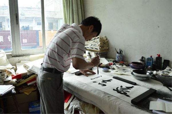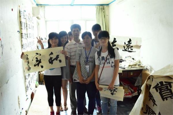 上午十点的时候,大家几经周折打听到达了雷州碑林创始人李建华工作的地点建华镜画,那是一间小店铺改装而成的简陋工作室,据说李建华老师平时在那里创作办公。然而大家去时店门紧闭,最后通过电话联系说明情况,大家才得以从巷子里的侧门进去。李老师和大家解释他现在已经闭门专心创作,很少接待来访了,这让受到“独特待遇”的队员们很是感动。接下来李建华老师耐心为调研组的问题做了答复,他讲述了碑林的创建过程以及背景,表达了自己对书法艺术的热爱,希望大家热心宣传雷州碑林文化。访谈将近一个上午,李老师和大家聊的很愉快,最后甚至兴起之致,当下挥笔泼墨写下箴言赠与大家,令队员们惊喜万分。