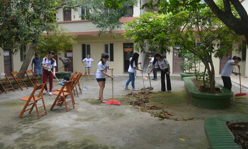 队员们分工合作,有的去买水果和面,有点留在敬老院里打扫卫生。队长带领队友们帮忙清洁小院,除青苔,去污垢,通水道。不一会儿,小院被我们打扫得干净整洁了。