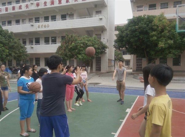 一个个小萝卜头端端正正地站好后,上课开始了。在我们的大厨兼老师的吴队员深入浅出的理论讲解之后,便是热身运动——绕着篮球场跑三圈。顿时,不断有“嗒嗒嗒”的声音放出来,是孩子们拖鞋的声音,虽然说上体育课不能穿拖鞋,但是我觉得此时的孩子们无比可爱,身上有一种自然干净、天真无邪的气息。