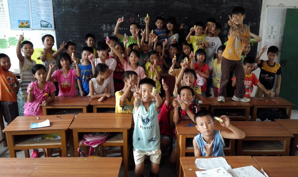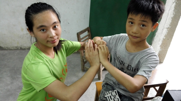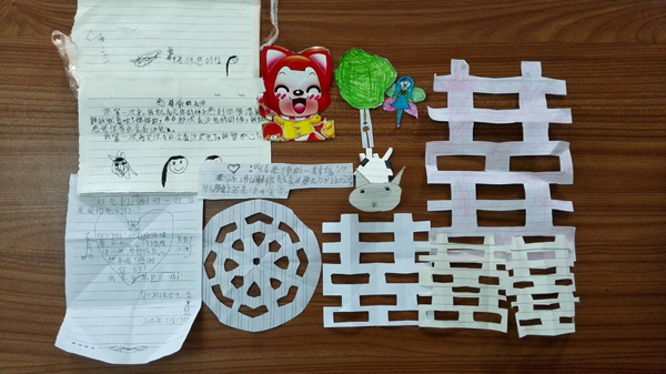 小小的举动,一点点的积累,足以撼动心灵。“一大早我一开门,就看到那个小女孩在帮我们整理桶和摆鞋”,一位晴天社会实践队的队员如是说。每天清晨,彩楼小学的孩子们总是在宿舍门外等待着队员们起床,为队员们整理散落在门外的鞋子,这是让队员们意想不到的。思想品德任课小老师以“感恩”为主题开展一次写“感恩的信”活动,课堂上孩子们都很用心的写着每一封信,有的还图文并茂。下课的时候,有一个心灵手巧的男孩子,给了她一个信封,里面他画着很漂亮的画,在上面写着“老师,我喜欢你”。而有一个女孩子则在她的本子里夹了一封信,给了她一个惊喜。信折得很漂亮,虽然里面仅仅是一些简单的祝福语,可是看到一笔一画的认真的笔迹,那里承载着她满满的祝福。这段日子以来,小老师们总会收到很多他们亲手制作的小礼物,例如剪纸、贴图、小纸条等,这些举动虽然很普通很平凡,但却有着一种神奇的力量,让晴天社会实践队的队员们与孩子们熔铸的不仅仅是浓浓的师生情,更多的是亲密深厚的友情。