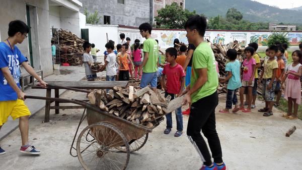 初见时,他们是一群在树下快乐玩耍的小身影。而第一次眼神交流时,我们在车上观察着这陌生的一切,他们在另一头好奇地看着我们的长途汽车缓缓地向学校驶近。下车走近,他们略显羞涩,想靠近却又小心翼翼。他们的皮肤因常年灼热的日光而变得黝黑,身材很瘦小,但却有如清泉般干净澄澈的眸子,眼神总有一种特别的穿透力,直击人心,笑起来宛如初夏的阳光般温暖而灿烂,深深地感染了我们。在简短的交谈过程中,他们渐渐地打开了话匣子,活跃地向我们介绍自己和学校的情况。我们了解到,实践队员们在他们心中的代称是“大学生”,对他们来说,“大学生”的一切都是一个个未知的故事,从我们的口中了解外面世界种种有趣的故事的渴望使他们与我们的距离一点点地缩小了。