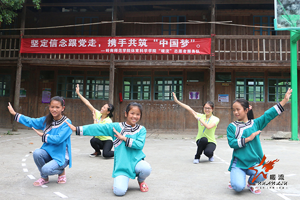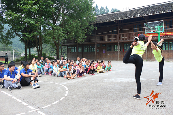 领导讲话结束后,“暖流”志愿者服务队为学生们带来精彩的体育表演,包括健美操、瑜伽、军体拳等,赢得了孩子们的热烈掌声。为了增进与留守儿童的感情,全体“暖流”队员带领在场留守儿童开展“萝卜蹲”、“老鹰抓小鸡”等小游戏。