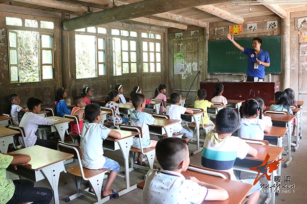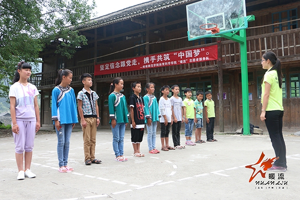 7月19日,在见面会结束后,“暖流”志愿者服务队队员分成两部分开展活动,一部分队员两人为一组入住到硐里村留守儿童家里与其“同吃、同住、同劳动”;另一部分队员在硐里小学以集体授课的形式开展语文、数学、英语以及结合体育专业特色的队列队形、武术、健美操、篮球等第二课堂教学。