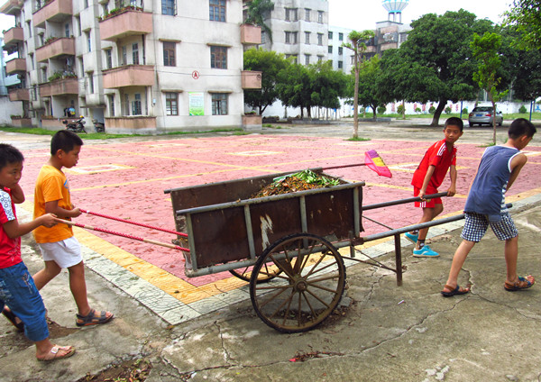 在大扫除的过程中,队员们是和学生一起行动的,不仅保证了学生安全,也培养了师生感情。学生们对小老师总有无穷无尽的好奇,他们在说笑间,脸颊挂满汗珠也没有喊累,衣服被泥蹭脏也没有叫苦。一群群小小的身影,有的躬着身子,挥动着手中的扫把,有的提着垃圾桶,把垃圾扫进桶里,有的推着垃圾车,接收一桶桶垃圾……他们有条不紊地做着活儿。当然也有一些调皮的男生总喜欢捉弄小老师,当小老师把垃圾铲放在垃圾前,他们会跑过来“帮助”。他们作出要用大力扫的样子,使得小老师担心会把垃圾弄散,他们“狡猾”地看小老师一眼,然后乖乖地把垃圾扫进垃圾桶,再笑着跑掉。