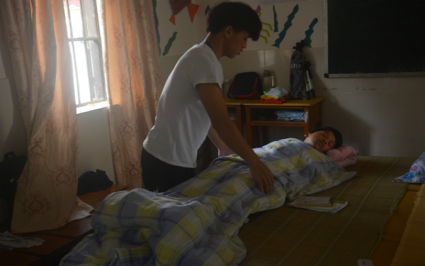 据了解,那个男队员是红土情缘实践队支教班级五年级的小班主任唐晨,平时对学生要求很严格,再加上健壮的体格,常常让五年级的孩子们畏惧他。今天五年级班上有一个男孩肚子突然不舒服,唐晨二话不说抱他到宿舍精心照料,宛如一个严父突然变成一个体贴入微的慈母,让那个平时怕他的学生感动得偷偷落泪。经过唐晨的照顾和一些队员的帮忙,孩子渐渐恢复润红的脸色,他回家前高兴的笑容和感激的眼神让队员们感到无比的欣慰。