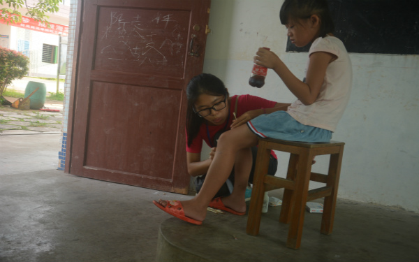 “哎呀,小朋友你怎么那么不小心呢?膝盖怎么弄伤啦?来这里坐着,等等姐姐拿药品过来给你擦药啊…”原本计划外出开展共建活动的红土情缘实践队的队员们,因在学校门口发现一个受伤的小女孩而延迟了半个小时才出发,但是却没有一个人有半句怨言。共建组组长表示,共建活动的宗旨是奉献爱,宣传正能量,如果只做个表面功夫,那是没有任何意义的。
