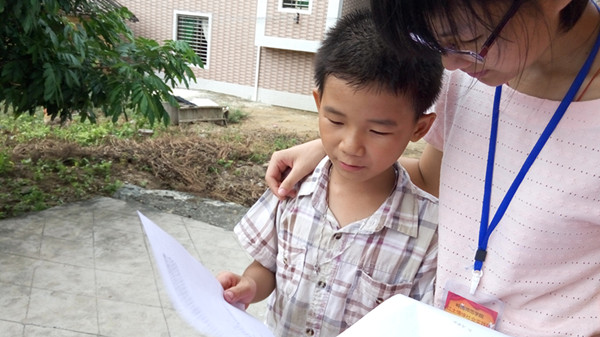 17点10分,记者跟随支教老师来到了小男生杨国墨的家里。之前记者从他的班主任那里了解到,国墨他是一个学习非常认真,又非常有礼貌的小男孩。果然,来到他的家里,他就非常热情主动地给老师们找来了碗,细心地倒开水给老师喝,转了一圈又跑到房间里拿龙眼给老师吃,他的爷爷也现场表扬他非常懂事。