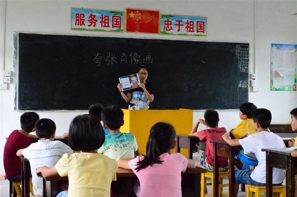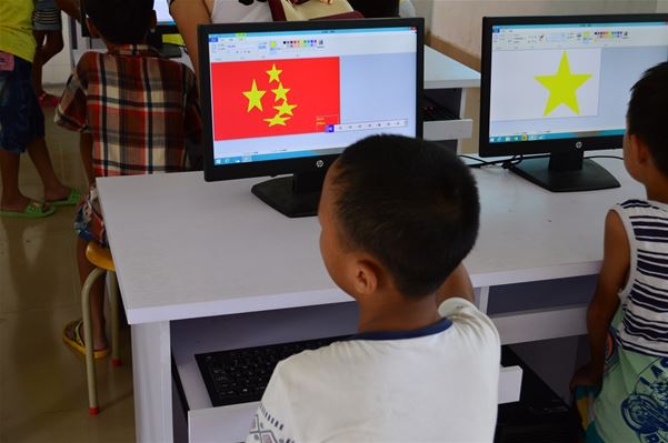 农村教学资源缺少,为更好引导小学生,队长在得到校长答应开放电脑室。虽然有一些家庭有电脑,但是他们并不知道怎样正确使用电脑。电脑课上,支教老师布置任务,用电脑上画图功能画五星红旗,调皮的孩子永远知道玩,嚷着要玩游戏,还叫嚣着这任务太简单了。但到他们真正实践时候,才发现并不是每件事都是那么简单,在老师的帮助下,他们顺利地完成任务,而且主动画其他的物体。在这里,他们要学的不仅是学习,还有在学习中找到乐趣。