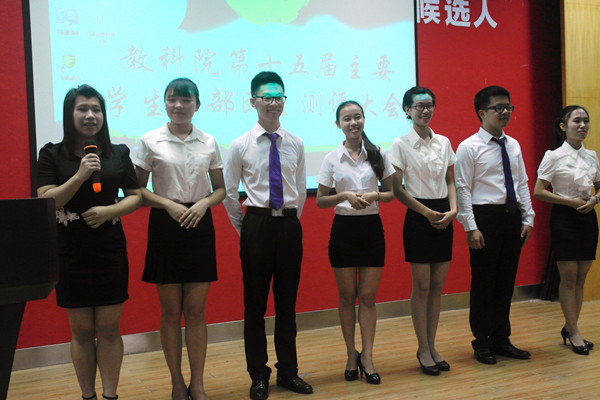 近日晚,教科院第十五届主要干部民主测评大会在鸿园四楼411报告厅举行。会上,教科院27名学生候选人依次进行演讲、答辩和接受民主测评,竞争17席主要学生干部岗位。教科院党委李德深副书记、全体辅导员、各兄弟学院干部嘉宾和教科院院干、各班代表参加了大会。