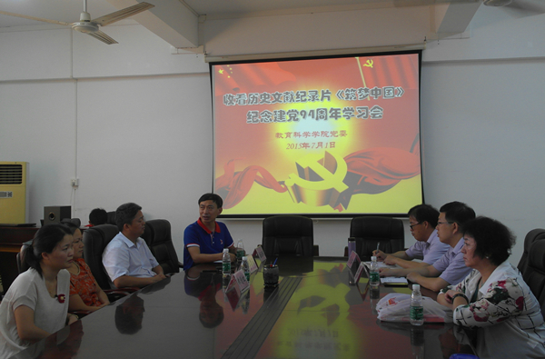 为了热烈庆祝中国共产党成立94周年以及进一步加强党员教育工作,7月1日下午,由教科院主办的“收看历史纪录片《筑梦中国》,庆祝建党94周年”学习会在燕雷楼四楼会议室举行。教科院党委赫云鹏书记、范兆雄院长、李德深副书记、周仕德副院长及教科院全体教职工党员和学生党员代表参加本次会议。