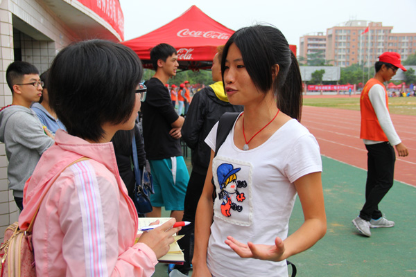 赛场上的欢呼声依旧响彻在耳边,而我们的采访则步入了尾声,在被问及荣获冠军后最想感谢谁时,她说起了她的高中同学曾慧娟,她在脑海中回味并带有一丝甜甜的微笑说:“我真的很感谢我的这个朋友,在早上我摔伤脚踝时,压力真的很大,我问她怎么办,她说‘我高中的时候发烧都跑,这点伤不要怕,坚持下去,拼了’我真的很感谢她。”良师的力量也是不少忽视的。由于在体育训练中,经常会出现受伤的情况,而老师就会及时给予料理伤口的提醒,同时关心学生。