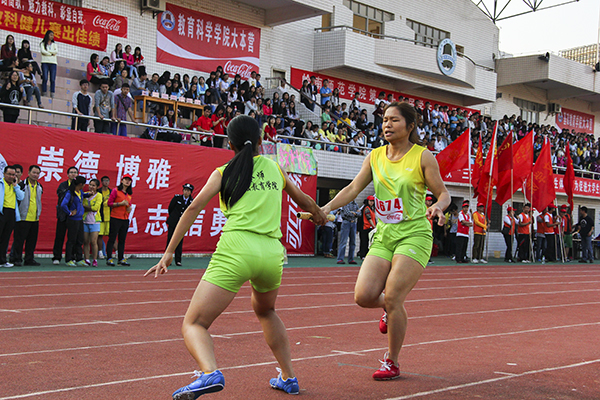 首先进行的第一组比赛尤其令人激动不已,比赛开始的第一圈里,信息学院一马当先,冲出赛道,夺得开始的优势,法政学院也不甘落后,奋起直追,在第二圈取得领先,同时,教育学院也赶超信息学院暂居第二。随后,在竞争最为激烈的第四圈,教育学院在第一个弯道突然发力,赶超法政学院。然而,在第二个弯道时,法政学院又在大本营热烈的欢呼和加油声中赶超教育学院,暂居第一。这时距终点只有不到100米的距离,当场下的观众都认为冠军已成定局时,在法政学院正冲过终点的那一刻,再次被教育学院赶超,以0.02秒的微弱劣势取得亚军。在第二组的比赛中,化学学院取得小组第一,总成绩第三的成绩。