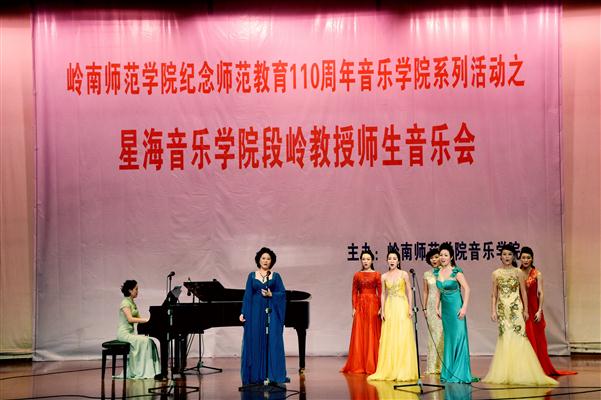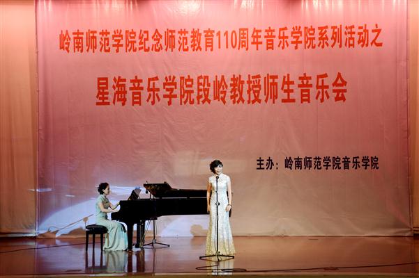 当日晚,段岭教授师生音乐会在校音乐厅举行。晚会由古诗词艺术歌曲、民歌与戏曲、创作歌曲、歌剧选段四个主题组成。段岭教授的学生分别为大家演唱了古诗词艺术歌曲《关睢》、《杏花天影》等。动听的旋律,优美的歌词,深情的演唱,赢得了在场观众的热烈掌声,掀开了音乐会的序幕。第二阶段民歌与戏曲,段岭教授的五名学生分别为大家演绎了不同地方特色的民歌。其中一首原汁原味的广东粤曲《荔枝颂》博得了在场观众的热烈掌声。在第三第四部分,段教授学生演唱的《塔里木》、《火把节的欢乐》、《清粼粼的水来蓝莹莹的天》等向观众展现了她们扎实的唱功。音乐学院两位同学也上台进行了交流演唱,他们精彩的表演同样赢得了满堂喝彩。最后,段岭教授压轴演唱的《远情》、《曙光》、《红梅赞》将音乐会推向了高潮,现场掌声不绝,气氛热烈。段岭教授对音乐学院领导团队的盛情邀请表示感谢,对学院师生的认真聆听表示感动,她说,“感谢音乐学院孙建华院长的热情邀请和前瞻性的举措,为学院师生营造一台这样精美的声乐盛宴,我愿为岭南师范学院音乐学院更好的发展贡献自己的微薄之力。