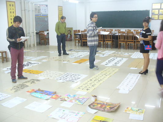 当天下午,由来自美术学院的陈志强、刘永胜、杨旭三位老师对进入决赛的作品进行场评审。评审过程中,老师们耐心地分别为绘画、书法及摄影作品作了详细的点评。