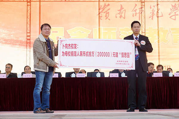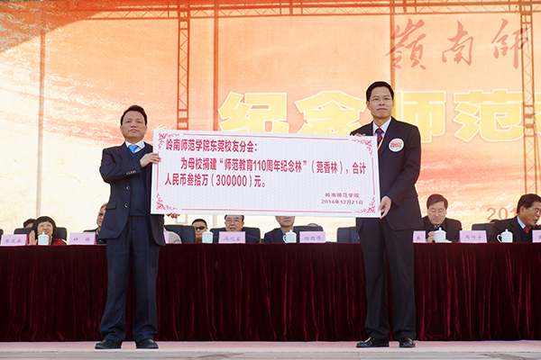 东莞校友分会向母校捐建“师范教育110周年纪念林”(莞香林),合计人民币30万元。