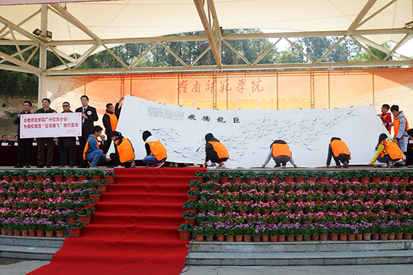广州校友分会向母校赠送纪念品。纪念品是一幅“巨龙腾飞”画作,画作全长7米、由110条龙虾构成,由广州校友分会副会长、著名画家黄荣校友历时近一个月创作完成。