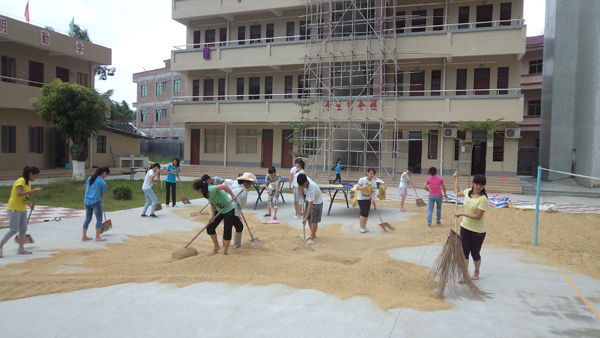7月8日,“童心同梦”实践队队员在大雨来临前成功地帮助学校老师收好晒在校园内的稻谷。
