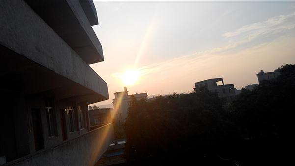 7月8日,我今天的任务是走访村民,第一次与这个陌生的地方来一次“亲密接触”。不知是太兴奋还是太期待,很早就醒了。 一走出课室改装成的宿舍,清风迎面吹来,凉爽爽的,吸一口气,好清新的空气,空气中还夹杂着稻花香,淡淡的。夏天的天总是亮得特别早,五点多天就很亮了。阳光从楼房那边照过来,散发出五颜六色的光,像彩虹一样。好美的太阳,这样的阳光在城市中是少见的,喜欢摄影的我立即拿出手机找准角度,连拍了几张,满足的放好手机,去刷牙洗脸。