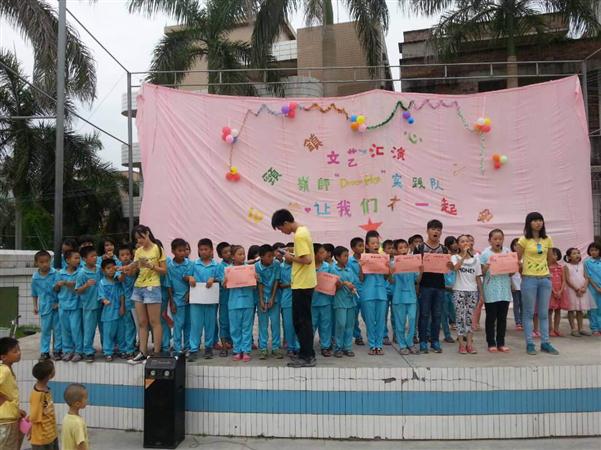 7月16日是“dream high”社会实践队在石颈镇中心小学的支教活动的最后一天。“dream high”社会实践队宣传组按照原定计划,为石颈镇中心小学的小朋友们举行了“梦·让我们在一起”文艺汇演,给小朋友们搭建了一个展示自身才华的舞台。文艺汇演中,小朋友们精彩的表演深深地感动了每一位观众。在文艺汇演接近尾声时,孩子们都走到了队员们的身旁,给这些陪伴自己度过了愉快的9天的哥哥姐姐们一个深深的拥抱。