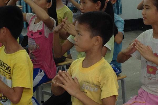看到他们拿着彩色的纸一一分发给二三年级的孩子们,告诉他们表现良好的就可以在上面盖一个章,到最后章数最多的就可以有奖品,数十个小孩子看着教员手上的一叠彩纸好像是看着金子一样目光发亮,我微微一笑。还有教手语的文艺组组员,在四五六年级的孩子们面前,耐心地一遍又一遍地做着动作,记得是《国家》这首歌,先让孩子们读几遍,那响亮的读书声,让整座小小的学校都为止感叹,不过是一个教室的声音。当时我还在宿舍楼里睡午觉,也被弄醒了,走去那间课室一看,闷热的天气,只有两台风扇,对孩子们和教员们来说都不是大问题,“国”和“家”的动作一遍遍重复着,十指搭成八字檐,两掌合成一字国,配上音乐,加上孩子们跟着唱的旋律,难以不为之动容。