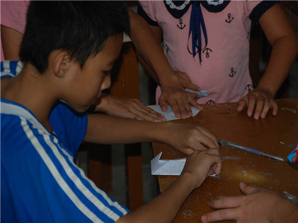 下课前,老师让学生写一封感恩的信给我们任何一位老师,期间,“雷霆一班”的班长代表全班向队员们致意,感谢队员们为学校带来趣味暑假,更感谢队员们即便遇上“威马逊”台风,也没放弃支教,毅然回归。老师看了忍不住流下了感动的泪水。班会结束后,学生们拿着叠着各种花式的信激动又小心翼翼地交给老师们,拿着一沓信的老师们像是中了大奖一般,脸上都乐开了花,这同让后勤组、新闻组等在背后默默奉献的队员们羡慕不已。