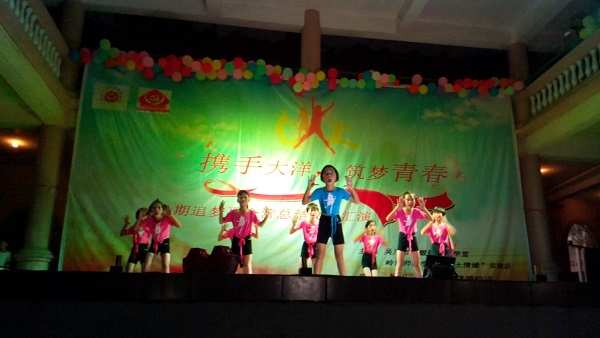 仪仗队拉开了晚会的帷幕。随后,青春活力的啦啦操、优美的舞蹈、时尚走秀、武术、手语、大合唱等精彩节目纷纷上演。四年级担任仪仗队,率先出场,孩子们小小的身躯上挂着大大的鼓,尽管如此,孩子们还是表现得很好,鼓声震天,气场十足。紧接着,由实践队队员们带来的活力动感的《one two three》啦啦操,展现了红土情缘队员们饱满的精神,大学生青春活力风范,青春般的激情激荡在大洋学堂的每一个角落。随后的特色走秀《show time》让人眼前一亮,孩子们穿着老师自作的时尚服装,在舞台上展现自己的风采,彰显新一代的魅力。紧接其后,由实践队队员和学生们带来的《壮哉我大中华》的武术表演,震撼了全场,全场的气氛再度升高,家长们看到自己小孩在舞台上表演情绪异常兴奋,脸上满是自豪的笑容。