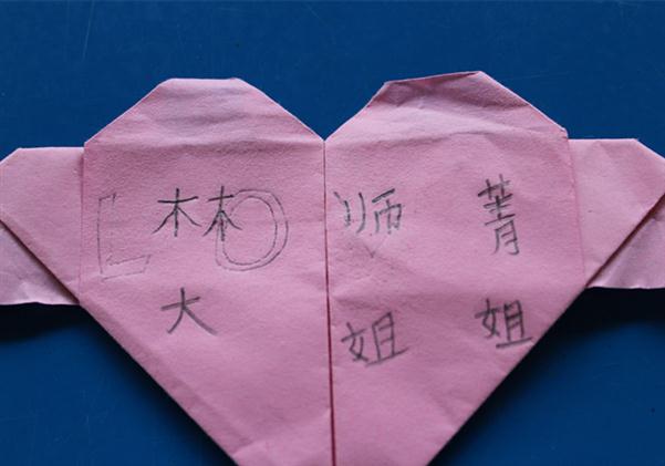 每次上手工课,很多孩子折好“心形”“飞机”等作品后第一反应就是把它送给我!其中还有很多孩子特地工工整整地写上祝福语或者重新折一个更漂亮的才送给我,这种用心的“简单爱”让我好感动,好幸福。上手工课和美术,孩子们总是非常期待我给他的作品点评,她们对我的每一句简单的肯定和赞美的话都感到非常满足,对我指出的每一个修正意见都报以乖巧认真的听从,孩子们这种信任对我来说是一种肯定,更是一种鼓励。