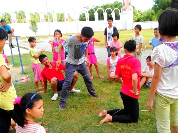 跟随“红土情缘”三下乡实践队来到大洋学堂第五天。备完课后,我百无聊赖地在校园里到处走走。走到篮球场旁的草坪的时候,我先是惊呆了,平均年龄20岁的队员们正在跟读一二年级的小孩儿们跳皮筋!然后我就笑趴在了草地上,看他们笨拙地跳皮筋!笑着笑着,我沉默了,我的疑惑终于有了答案——我的童年,缺了一条皮筋和一群跟我跳皮筋的小伙伴。
