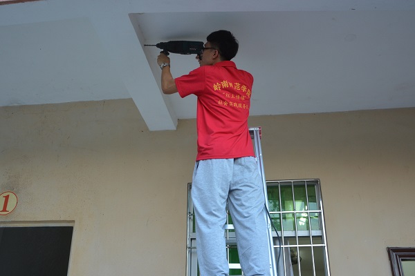 当我们想洗澡的时候,遇到了一些难题,发现男队员住的地方下水道被堵住了,我们尝试着用木棍打通下水道,可就是不行。更加糟糕的是还发现洗澡房没有水,晾衣服的地方很窄。队长马上向校长反映了这些情况,校长很积极地帮助我们,提供工具。队员们马上干起来,拿上铁丝,铁钳,电钻,在宿舍外面钻洞拉铁丝,看着队员们的动作娴熟,记者都觉得有些惊讶,很快一条铁丝就拉好,以后我们再也不用担心没地方晾衣服了。