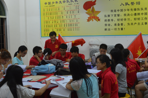 仍记得我们在“威马逊”来临时一起度过的那个下午。7月18日下午,“威马逊”强台风袭击我们的实践基地,我们坐在饭堂里一起度过。队长韩忠军首先召开了紧急会议,商讨可能会发生的事情以及相应的应对办法,他还鼓励我们只要大家团结一致,不怕困难,沉着冷静,就一定能克服各种困难。随后,大家利用难得的空闲时间开展各种活动。有的打牌,有的剪纸,有的练毛笔字,有的聊天,有的看电影,有的备课,有的写心得,有的写新闻稿。饭堂热闹非凡,笑声不断,一点没有紧张、低落的情绪。
