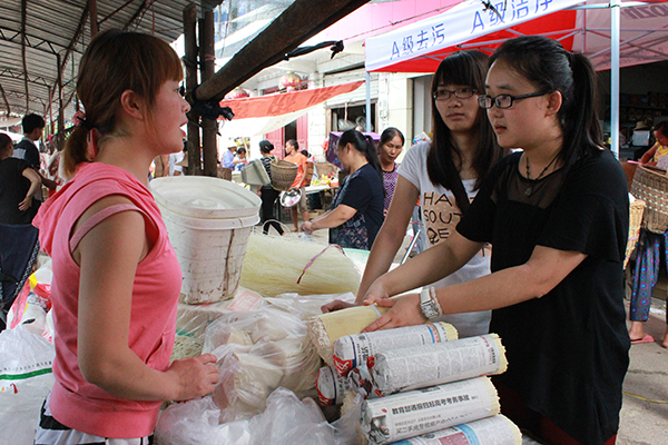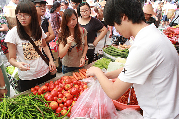 眼看太阳已经高高升起,后勤组组长陈晓宁给大家交代完采购任务后,大家就开始行动了。买蔬菜的、买米的、买面条的、买调味的,实践队队员在领略当地风俗的同时,也抓紧时间购买物资,更是发挥队员优势和卖东西的老板讨价还价,场面十分热烈有趣。在讨价还价之余,队员们也不忘与当地的百姓拉近距离,大力宣传自己的实践队,扩大实践队的知名度和影响力。