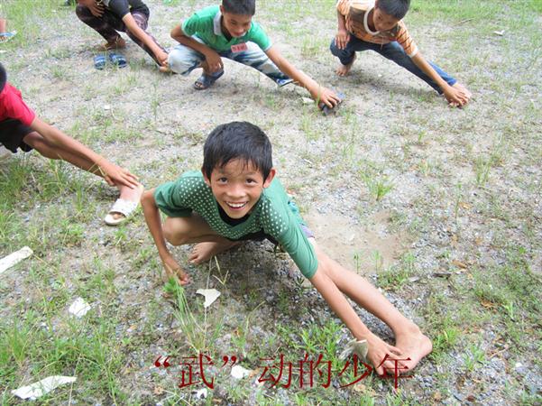 上午8:00,服务队的体育生们教孩子们打拳。孩子们来到教室门前的操场上,整齐地排好队,在老师的带领下做了预备运动。接着,他们开始了武术的学习。看着学生们脸上的笑容,服务队的队员们感到很欣慰。一位学生对来采访的服务队记者说“我们爱武术,希望能学到更多的武术”。当记者问到他们怎么那么喜爱武术时,另一位学生说“学习武术能够强身健体,能让我变得更强!”记者还了解到,这里的孩子都是来自贫苦的农家,平时回家要帮助家里干农活。在学习和干活之余,孩子们会聚在一起看武侠电视,有些还喜欢看武侠小说。课间,谈论武侠电视剧或武侠小说成了他们每天的娱乐活动之一,有时兴起了,还当着老师与同学的面“舞”上几招呢。遇上这么一群“武术迷”,服务队的体育老师们开心极了,迫不及待地想把自己所学的都教给他们。