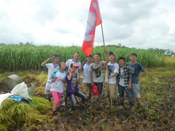 拿起镰刀,队员们也可以像技术娴熟的农户一样,割起来像模像样的。没有接触过镰刀的队员担当起收集稻谷的重任,往返于田间泥水之间。田泥,被脚踩得松软,一脚下去半个膝盖都没进去了,泥水溅起,裤管和上衣被溅上点点的污泥,看起来与这个泥塘更加的融和了。