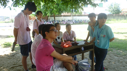 “葵曦”副队长周丽燕和张坤燕搬来凳子在树荫下接待了他们,只见他们其中的一员很谦虚地表明了来意, “我们是学习一下兄弟队的管理学生的方法,看看我们有哪些不足之处可以改善的”。大家都会意地笑了笑,纷纷围着桌子交流经验,周丽燕首先跟他们介绍了我队的规模和招收学生的情况。来访队员们都竖起了大拇指称赞我队学生数量多并且学生的积极性和自觉性高。其中有位女生表示很羡慕可以教这么多学生,因为这样会更有成就感。接着,大家又谈到日常生活,‘梦醉珊瑚海’来访队友表示在宿舍的条件下两队都大同小异,都是睡教室,但是说到伙食,有些女生就埋怨每天早餐都是面包。这时我队队长自然而然地就说到我们的炊事故事,就是一位大厨和几位菜鸟的争斗,他们每天都变戏法地给大家做不一样的菜,最终受益的是我们这帮“吃货”。说到这,来访的一位女生就开玩笑请求队长收留她,逗得大家开怀大笑,大伙儿谈话都很幽默,显得气氛特别融洽。