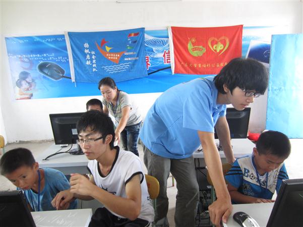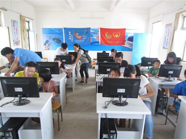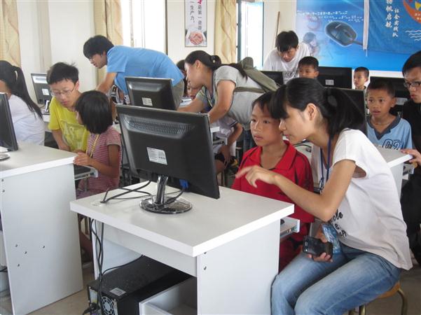 电脑培训是“扬帆启航”实践队关爱留守儿童的项目之一。17号上午,在队员的组织下,四年级的全体学生分为两批,进入电脑室学习基本的电脑操作。