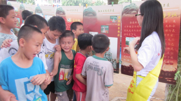 下午3点许,在该校学生的热烈掌声之下,宣传活动正式开始!服务队队员先是指着内容丰富的历史宣传图片,为同学们讲述源远流长的背景故事。接着,服务队队员们又在同学们当中开展了有奖红土文化历史知识问答。同学们的踊跃回答直接就把活动的进程推向了一个高潮。