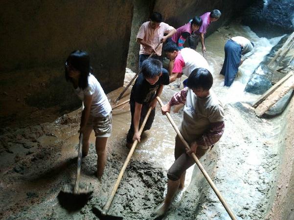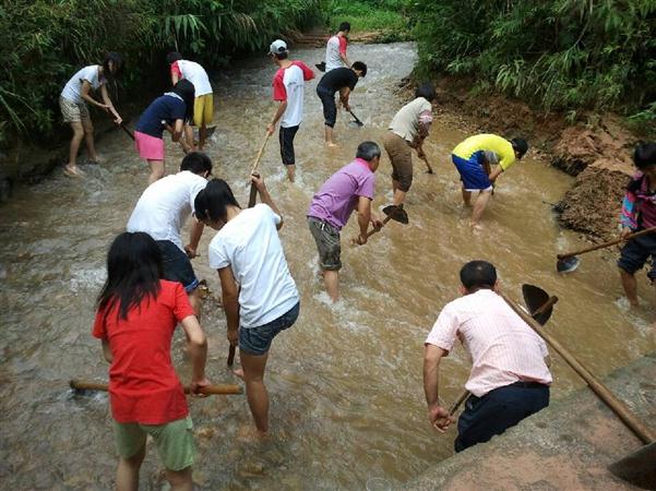 16日下午,一场暴雨突如其来,导致清水河里淤泥大量增加,河水流通不畅。当天晚上,“夏日符号”社会实践队队员得知当地村民准备第二天早上去清水河清理淤泥,疏通河道的消息后,纷纷表示要加入到他们的队伍中去。第二天,队员一大早就起床了,吃完早餐后就与村民一起拿着工具,向目的地出发。步行到达目的地后,队员与村民一起跳入水中,拿起工具,开始清理河道里的淤泥。在这一过程中,队员们个个奋勇争先、干劲十足,不怕累不怕脏,尽管衣服都被汗水和泥水浸透了,但是队员们始终坚持到了最后。